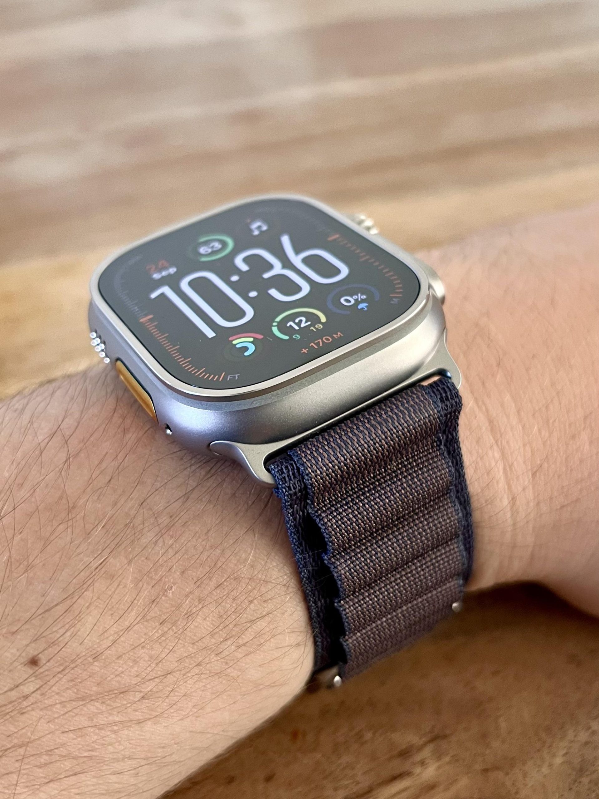 اپل واچ اولترا ۲ نسل دوم از حرفهایترین ساعت هوشمندی است که اپل تولید کرده است. تمامی مدلهای اپل واچ اولترا ۲ با بدنهای از جنس تتیانیوم و رنگ تیتانیوم تولید شده و مدلی که درحال مشاهده آن هستید با بند پارچه ای(الپاین) نیلی تیتانیوم رنگ عرضه میشود. اپل واچ اولترا ۲ دارای یک نمایشگر ۴۹ میلیمتری OLED است که حداکثر روشنایی آن به ۳۰۰۰ نیت میرسد؛ بنابراین در محیطهای پرنور و یا زیر نور مستقیم آفتاب، نمایشگر ساعت بهراحتی قابلمشاهده خواهد بود.